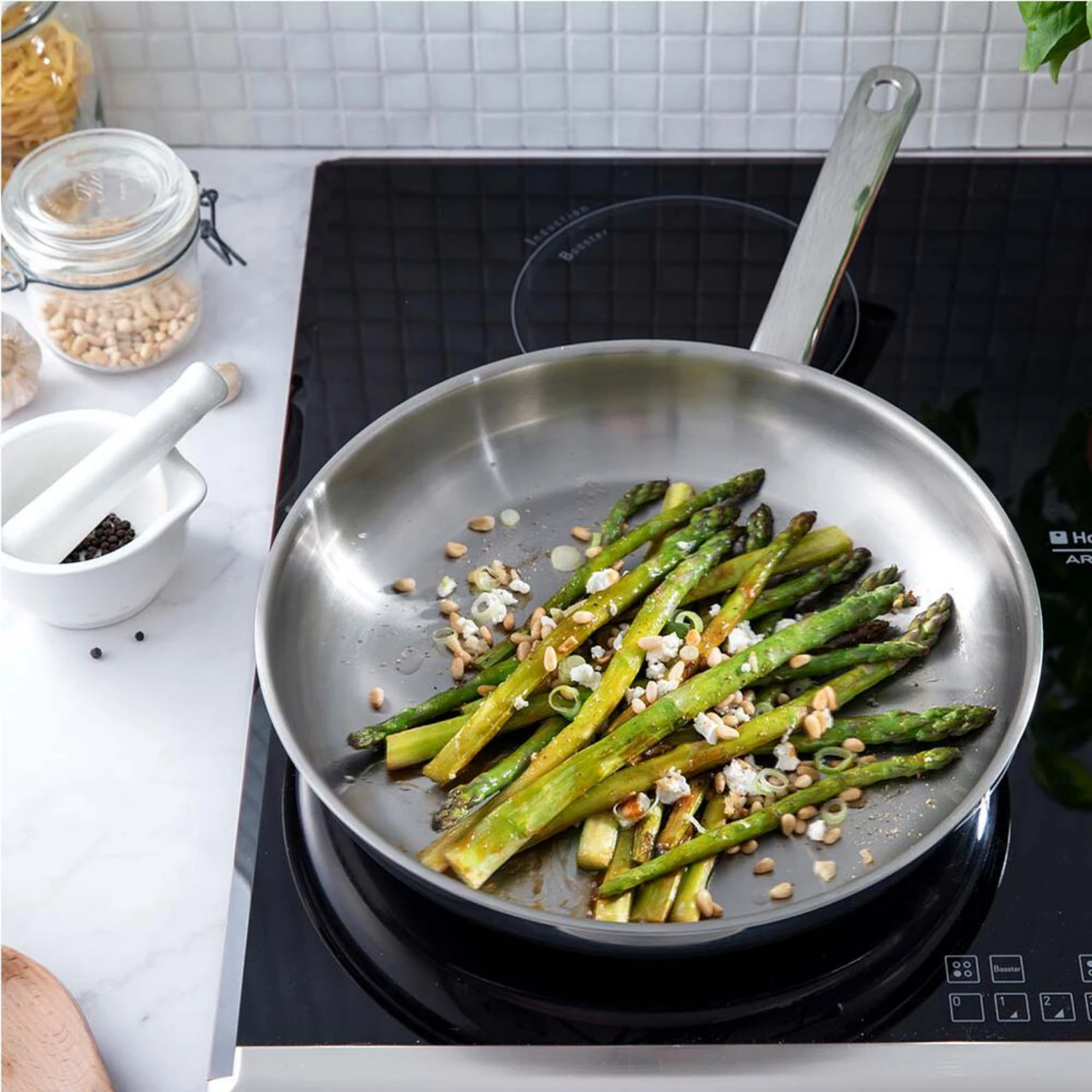 De BK Bright koekenpan Ø28 cm wordt gekenmerkt door een mooi contrast tussen een gesatineerde binnenkant en een gepolijste buitenkant. De stevige roestvrijstalen greep zorgt ervoor dat de pannen op een hogere temperatuur in de oven kunnen en zijn geschikt voor alle warmtebronnen, inclusief inductie. Na gebruik kan de pan in de vaatwasser.