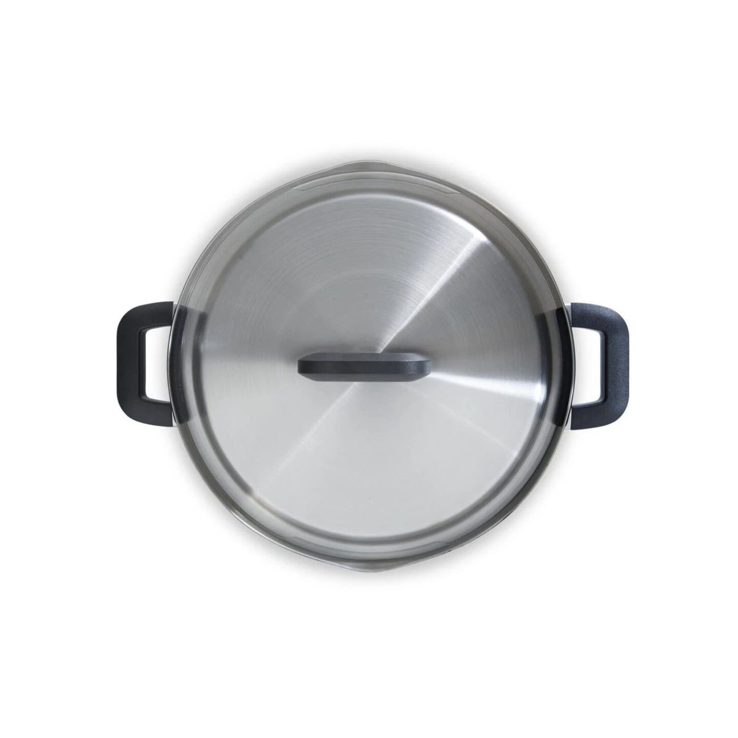 Een stoere zwart rvs soeppan om heerlijke soep in te koken. De BK Flow Cool Black soeppan Ø24 cm heeft een inhoud van 6,5 liter en is voorzien van een veilig en uniek afgietsysteem. Met een simpele kwartslag draai, vergrendeld de deksel onder de zwarte siliconen stoppers. Zo kun je op een veilige manier met twee handen afgieten.