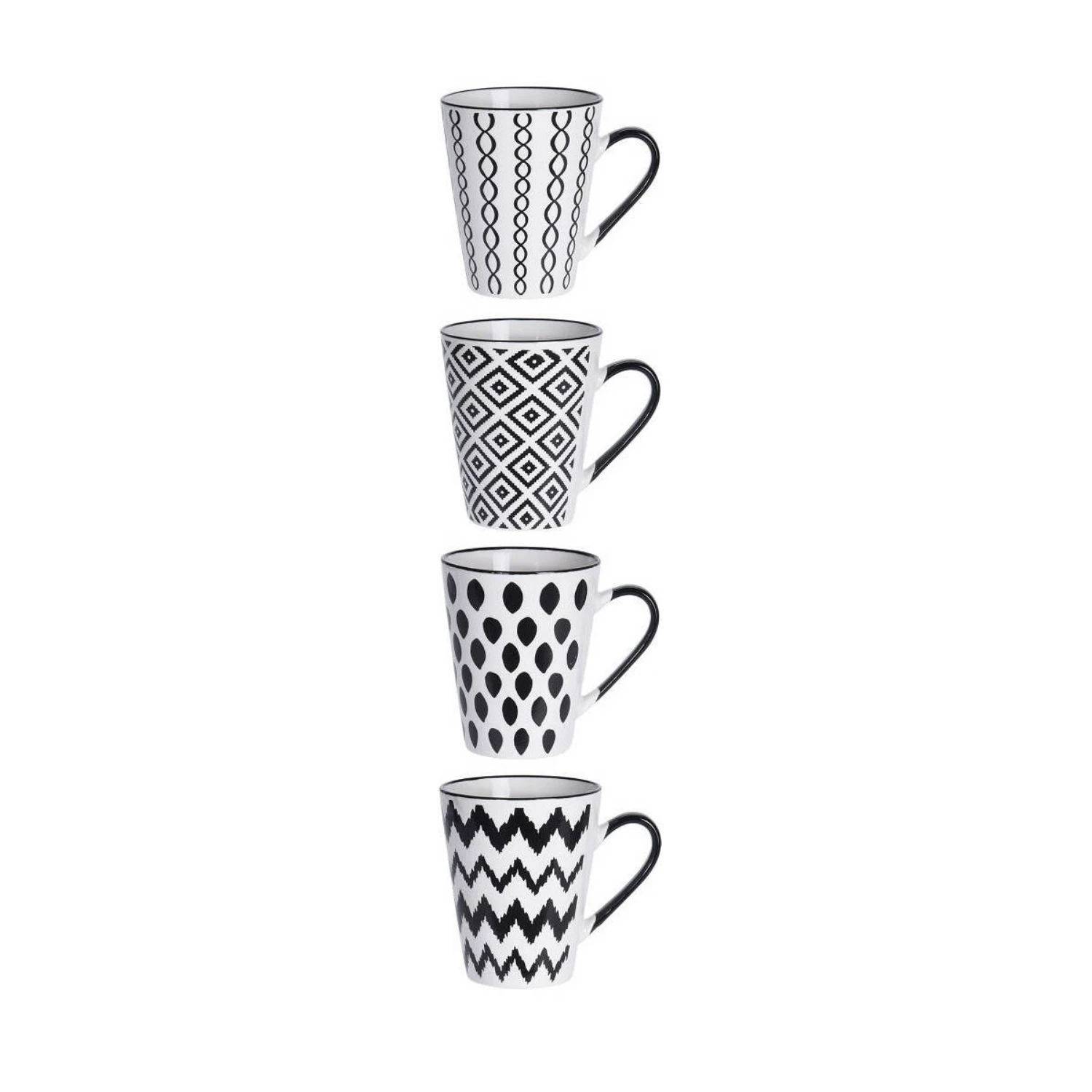 Deze leuke Excellent Houseware bekers kan je ophangen aan een metalen rekje. Zet ze prominent in je keuken als accessoire! Elke beker is uniek en heeft een print in de kleuren zwart en wit. Afmeting rekje: 28 cm x Ø16 cm. Afmeting beker: 10 cm x Ø9 cm.