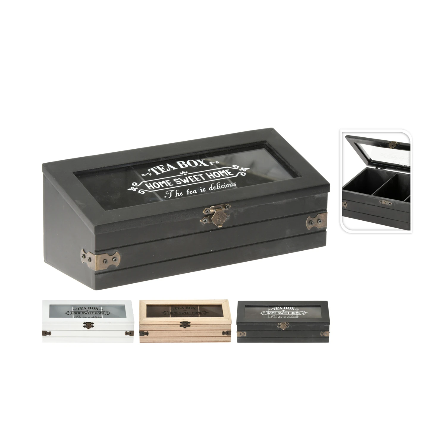 Bewaar en serveer je thee in stijl met deze houten theedoos van Excellent Houseware. De theedoos heeft 3 vakken en een transparant deksel van glas. De theedoos is er in 3 kleuren, wit, beige en antraciet.