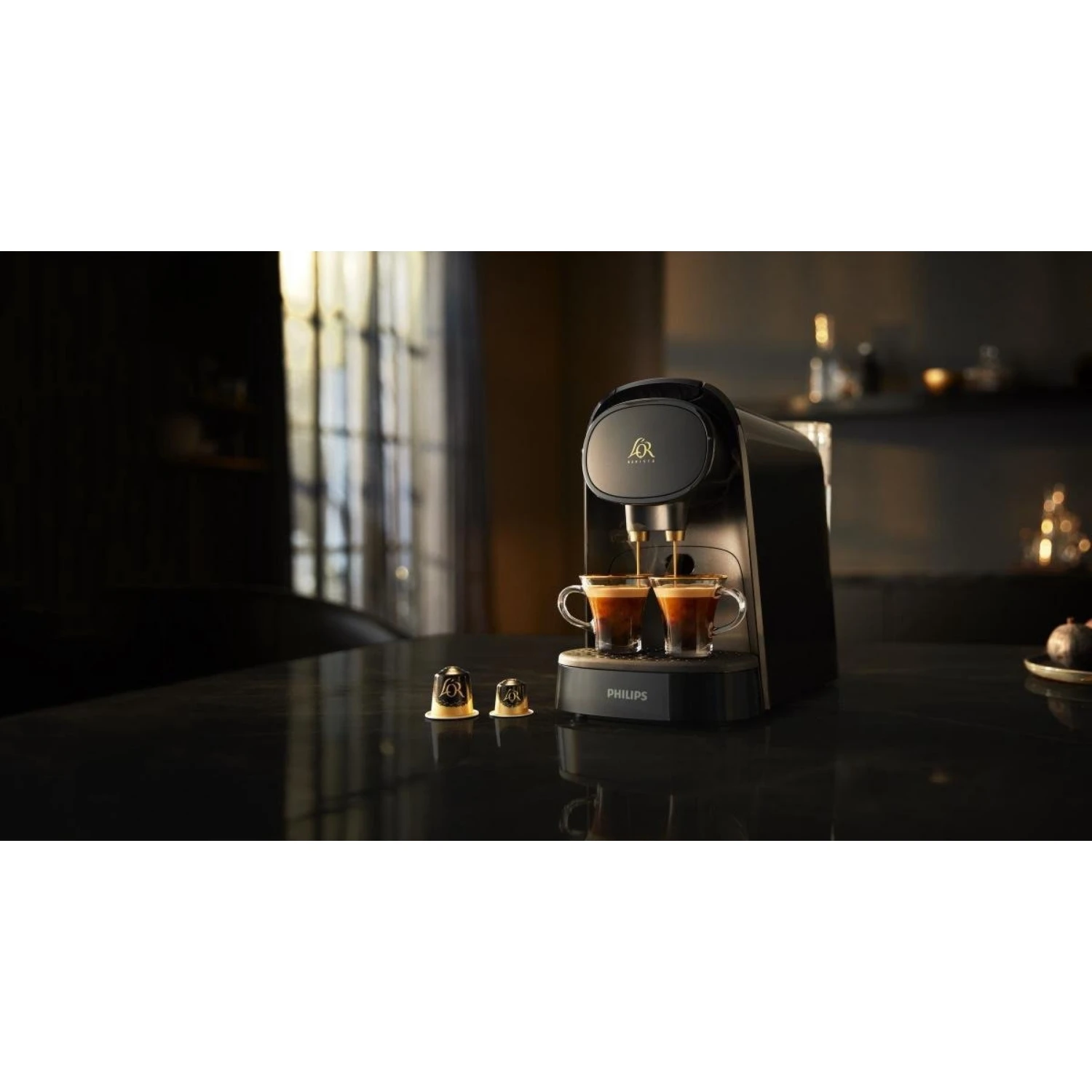 Deze L’OR Barista-koffiemachine zorgt met zijn dubbele functie voor dubbel zoveel plezier! De koffiemachine voor capsules heeft een zwarte luxe uitstraling. Het exclusieve systeem geeft je de mogelijkheid om 2 espresso’s tegelijk of een dubbele espresso in 1 kopje te zetten. Naast espresso kun je er natuurlijk ook je andere favoriete koffie mee zetten, of het nu een Lungo, een dubbele Lungo of een Ristretto is, geniet van je koffiemomentje! Bij het mooie apparaat krijg je een mooie verrassing. Het wordt geleverd met een breed assortiment capsules: 4 L’OR Espresso-capsules voor enkele shots en 5 L’OR Barista-capsules voor dubbele shots.