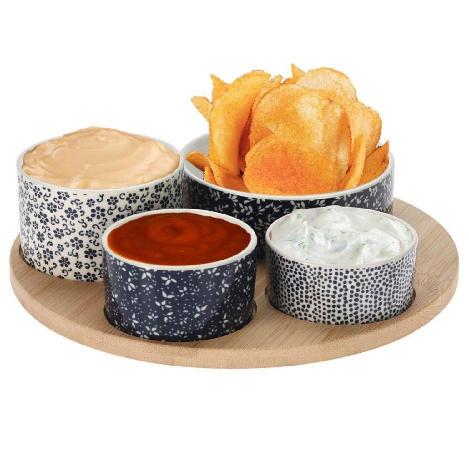 Deze 5-delige set van serveerschalen op een houten plateau is ideaal voor het alledaagse gebruik om suikerklontjes, theezakjes en koffiekoekjes in te serveren. Daarnaast is de set ook leuk om te serveren met hapjes voor op verjaardagen en feestjes. De 4 schaaltjes van Excellent Houseware hebben elk een andere opdruk en formaat.