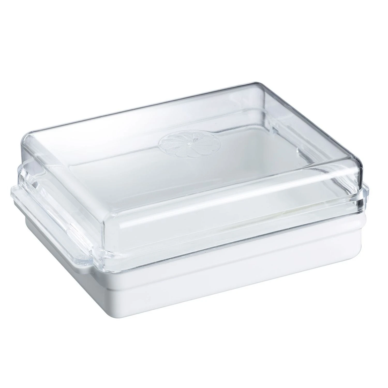 De praktische botervloot van hoogwaardig, robuust kunststof is perfect voor het bewaren en serveren van een stuk boter van 250 gram. Dankzij het doorzichtige deksel heb je snel overzicht over de resterende boter, en de hoge rand met handige greepelementen zorgt ervoor dat je altijd een goede grip hebt. Handig: deze botervloot past in de gebruikelijke beugels op koelkastdeuren – voor ruimtebesparende opslag.